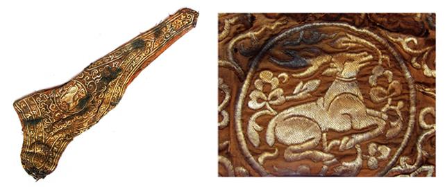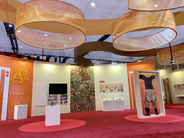展览还呈现了中国民族博物馆的一件重要藏品——元代用银裹金线织成的金碧辉煌的卧鹿纹金绣弓囊,以此展示出中国古代游牧民族骑射运动的历史等。