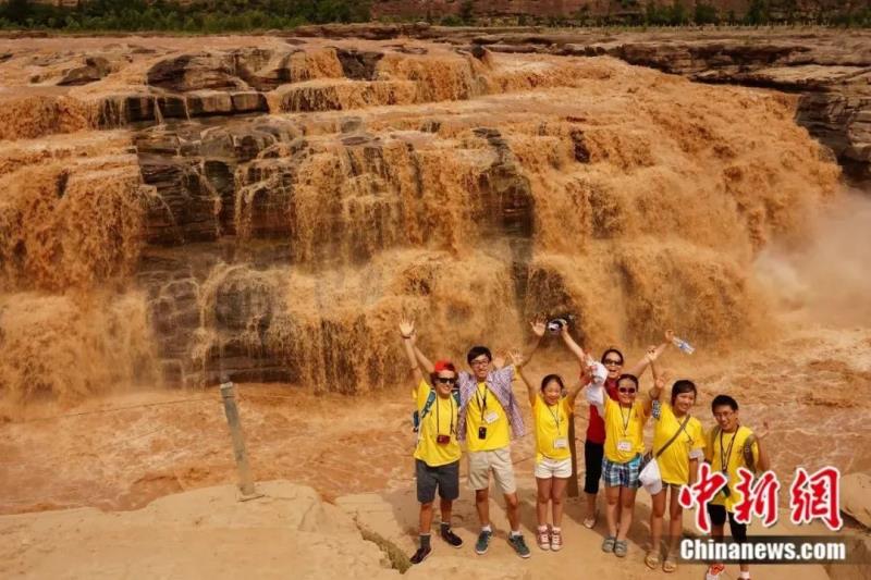 ▲2014年,参加“中国寻根之旅”夏令营的海外华裔师生来到位于陕西省延安市宜川县壶口乡的壶口瀑布参观。中新社发 刘尼威 摄