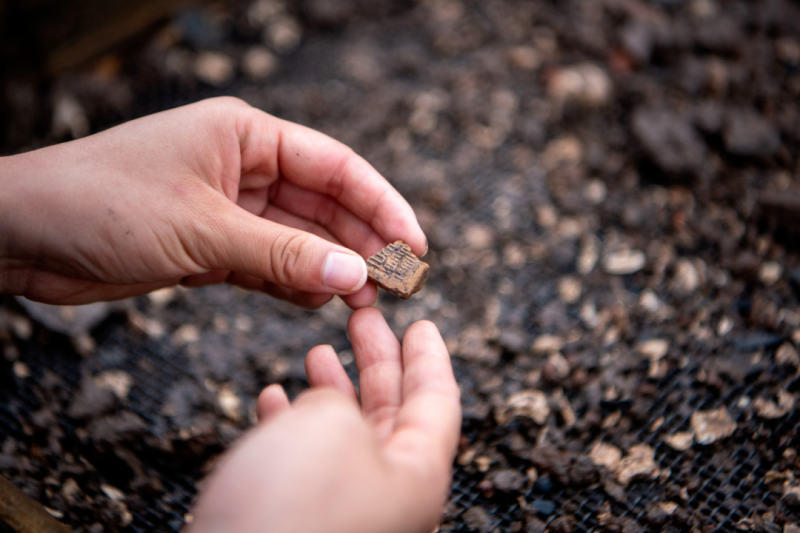 ▲考古工作者在云南河泊所遗址现场检查出土的封泥(2022年9月21日摄)。(新华社记者 江文耀 摄)