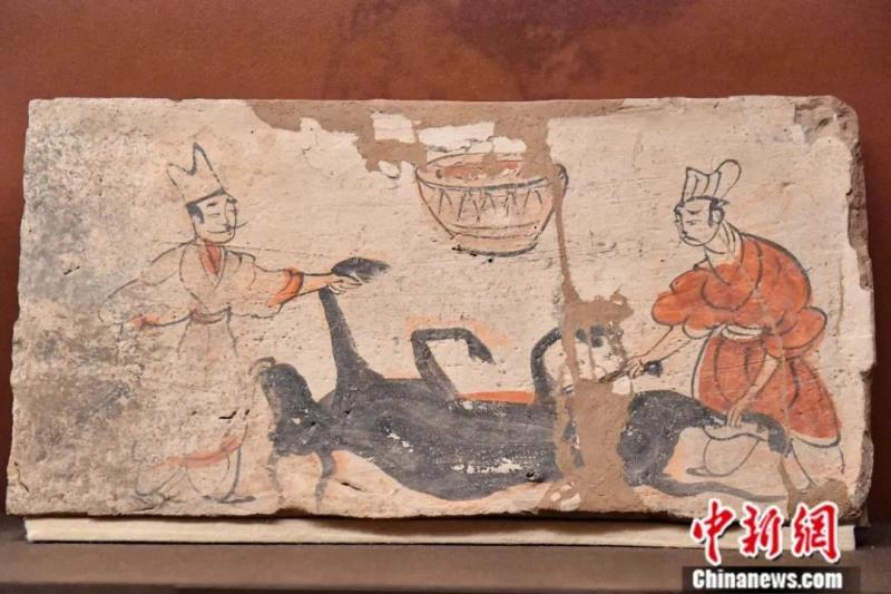▲河西地区魏晋彩绘画像砖文物“宰牛画像砖”。河西画像砖真实反映了古代河西地区民众的生活百态和精神面貌。(中新社记者 田雨昊 摄)