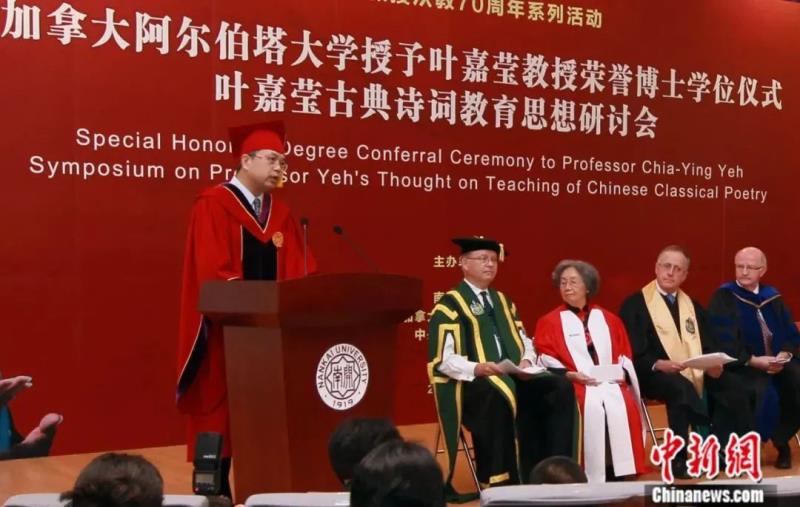 ▲2015年10月,加拿大阿尔伯塔大学在天津向叶嘉莹授予荣誉博士学位,以表彰她对于中国古典文学研究、教学和中西交流所作的杰出贡献。(中新社记者 张道正 摄)