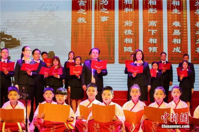 ▲2021年3月30日,在江苏如皋经济技术开发区实验小学儿童剧院,师生在对诵《德润春风 教化有道》。(中新社发 徐慧 摄)