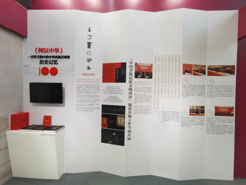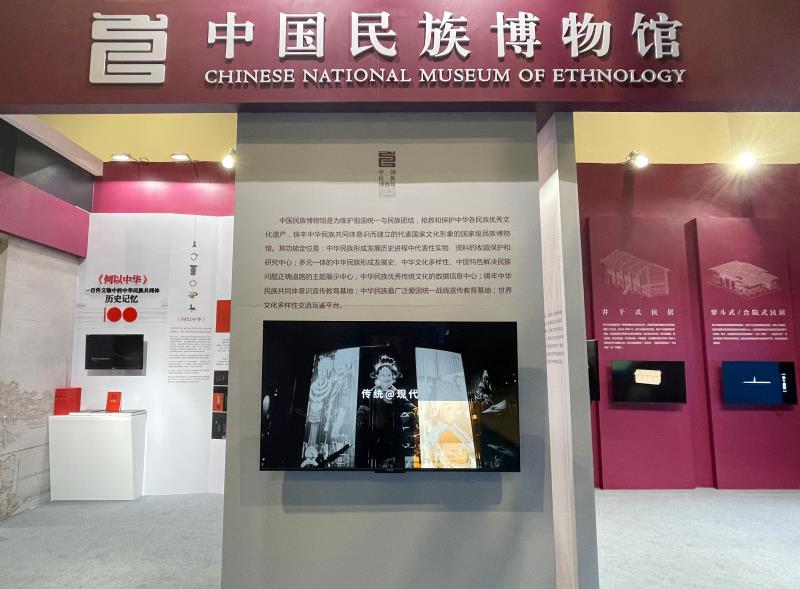 在本馆的展区空间,中国民族博物馆同时展示了本馆近年来所开展的部分业务工作及取得的相关成果。包括多语种出版物《何以中华:一百件文物中的中华民族共同体历史记忆》、《中国少数民族文物图谱》编纂工作以及《我们——铸牢中华民族共同体意识展》《东归·西迁》《中国少数民族传统体育文化展》《传统@现代——民族服饰之旧裳新尚》《中国少数民族情歌展》《爱的密码——民族服饰展》《古典爱情——中华各民族传统爱情文化展》《声音——中华各民族情歌文化展》《一线生花——中国民族刺绣展》等展览项目的视频。