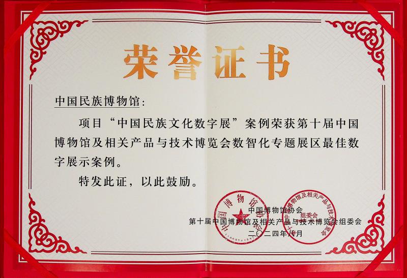 8月26日,中国民族博物馆提供的“中国民族文化数字展”案例获评“博博会”数智化专题展区最佳数字展示案例,并由中国博物馆协会和第十届“博博会”组委会颁发了荣誉证书。