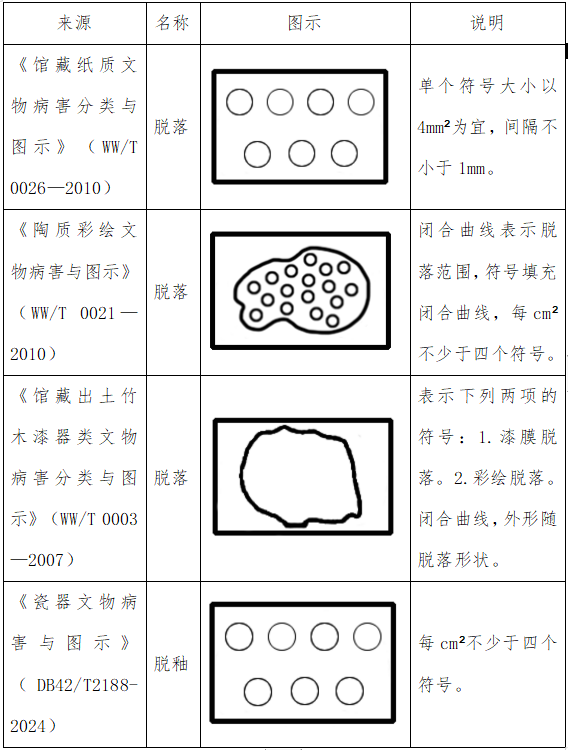 可行性。标准的编写注重与同一领域已有标准之间的协调,确保制定的标准具有可行性;同时结合湖北省瓷器文物病害与图示现状和问题的相关研究成果,继承和发扬相关标准合理的、科学的做法,对遗漏点进行补充。例如,为了与已颁布的相关标准保持一致,参照《陶制彩绘文物病害与图示》中酥粉的图示绘制病害“胎体酥粉”图示。(图2)在绘制脱釉病害图示时,借鉴《馆藏纸质文物病害分类与图示》中脱落的图示和《陶质彩绘文物病害与图示》中脱落的图示,同时充分考虑脱釉有界限不清晰,无法圈定范围的实际情况,对脱釉图示不做边界规定,只用小圆圈表示病害。(表1)