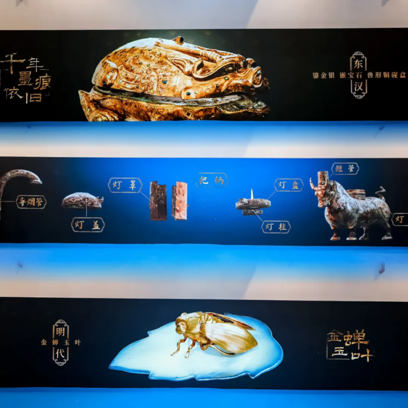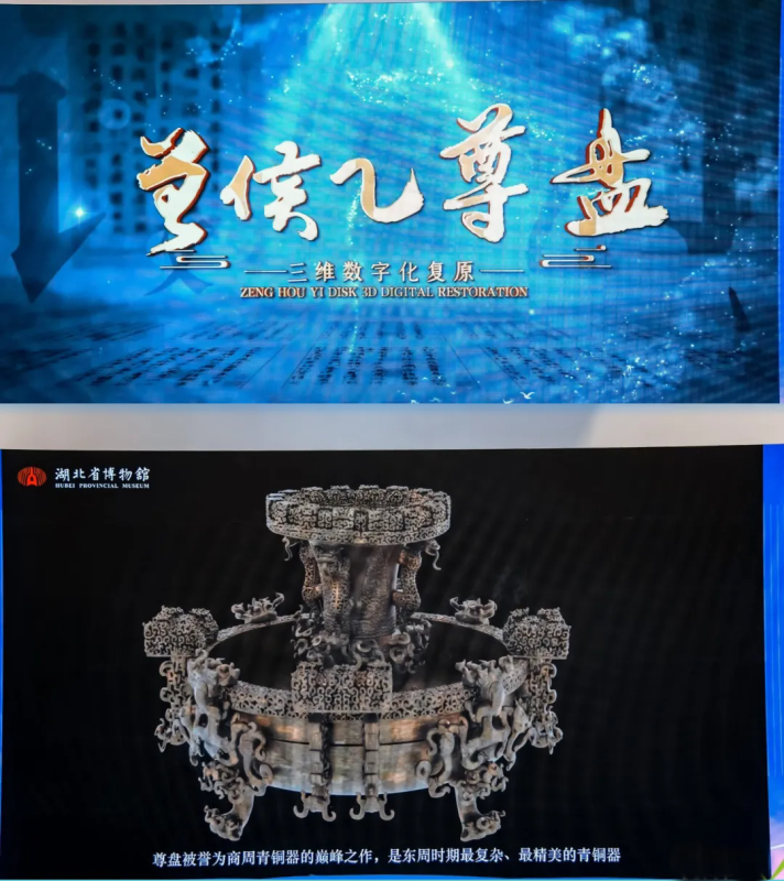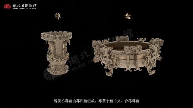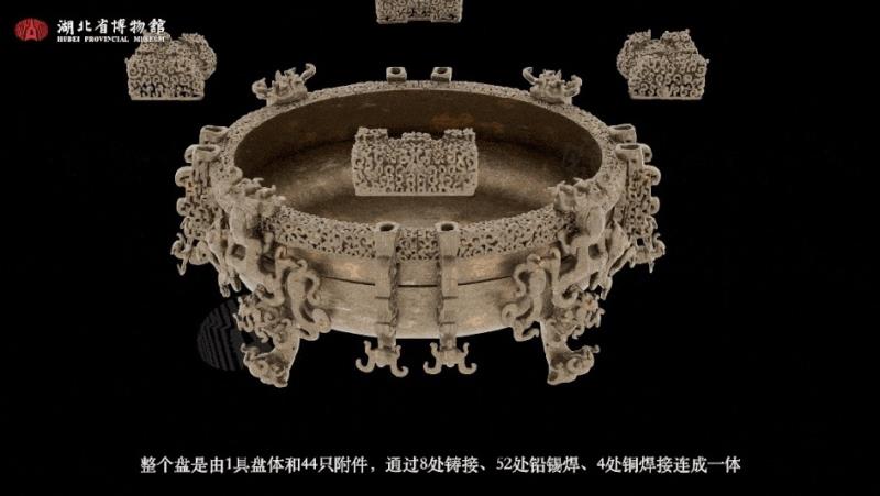 展项介绍:湖北省博物馆曾侯乙尊盘三维数字化复原成果由该馆文物保护中心主任江旭东博士主持实施。该成果通过数字尊盘结构"拆解",为观众庖丁解牛式地呈现尊盘纷繁复杂的结构,展现古人化繁为简的工艺思想和精益求精的工匠精神。