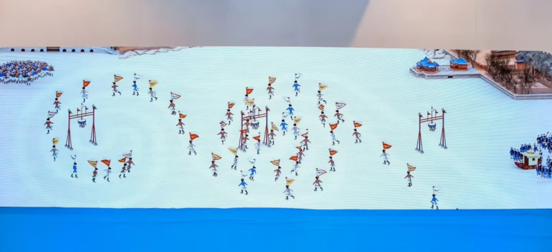 中国民族博物馆以两幅收藏于故宫、十八世纪张为邦、姚文瀚合笔绘制的《冰嬉图》卷和《紫光阁赐宴图》为蓝本,开发了大型数字动画《紫光·冰嬉》。动画在完整展示作为历史文化见证的两幅珍贵画作的基础上,提取其中文化、艺术和运动元素,借助二维手绘和三维建模相结合的数字展示手段,动态形象的展示“冰嬉”作为中国古代冰雪运动所呈现出的高度的冰上技术水平、运动艺术性和惊人的组织协调性,及其在世界冰雪运动史上的地位和对人类冰雪体育运动所做出的贡献;以《紫光阁赐宴图》为历史佐证,通过对历史场景的复现展示“冰嬉”不仅仅作为一项冰雪运动,同时作为国家文化礼仪而显示出的巨大文化感召力,及其在巩固国家政体、促进民族团结的政治功能。