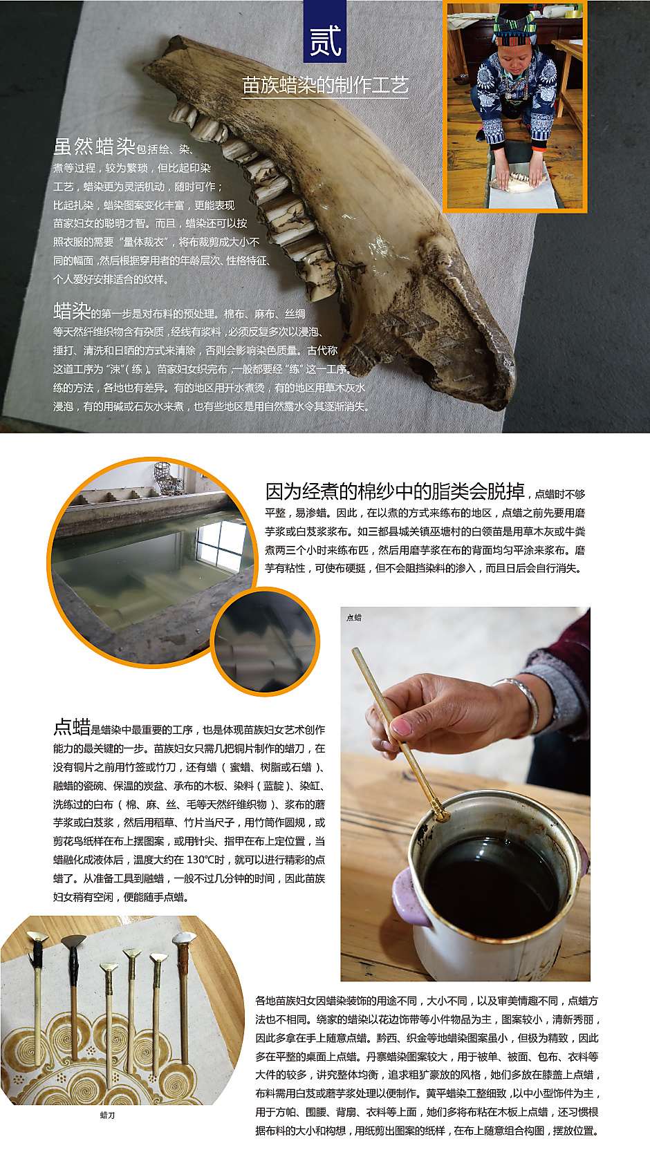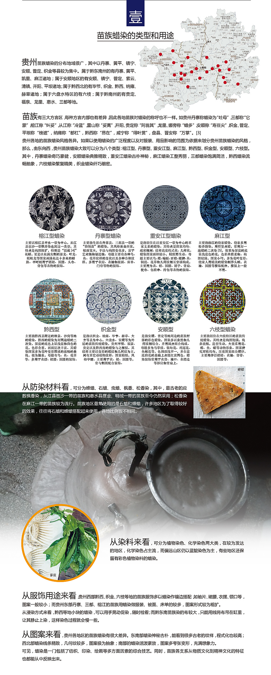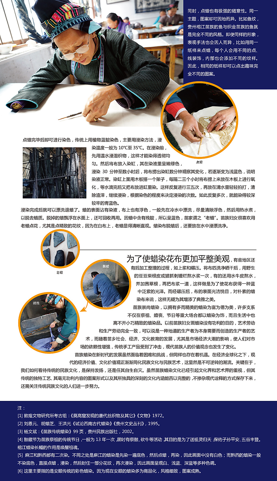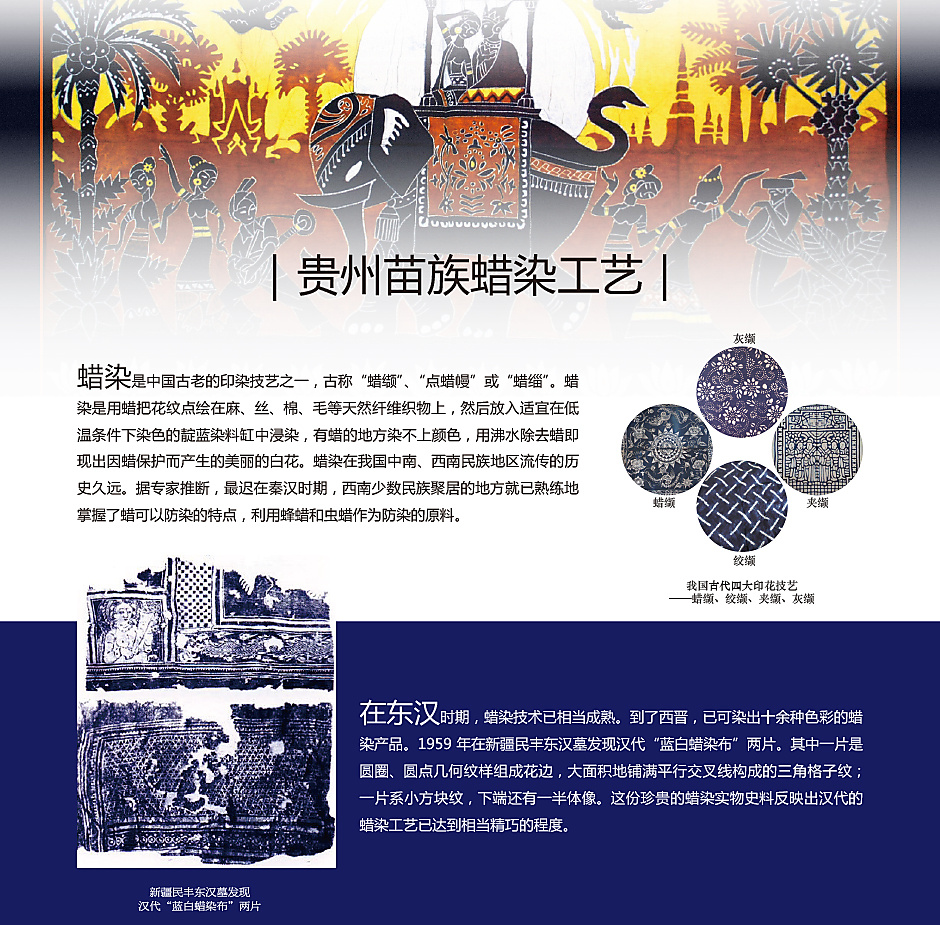 蜡染是中国古老的印染技艺之一,古称“蜡缬”、“点蜡幔”或“蜡缁”。蜡染是用蜡把花纹点绘在麻、丝、棉、毛等天然纤维织物上,然后放入适宜在低温条件下染色的靛蓝染料缸中浸染,有蜡的地方染不上颜色,用沸水除去蜡即现出因蜡保护而产生的美丽的白花。蜡染在我国中南、西南民族地区流传的历史久远。据专家推断,最迟在秦汉时期,西南少数民族聚居的地方就已熟练地掌握了蜡可以防染的特点,利用蜂蜡和虫蜡作为防染的原料。