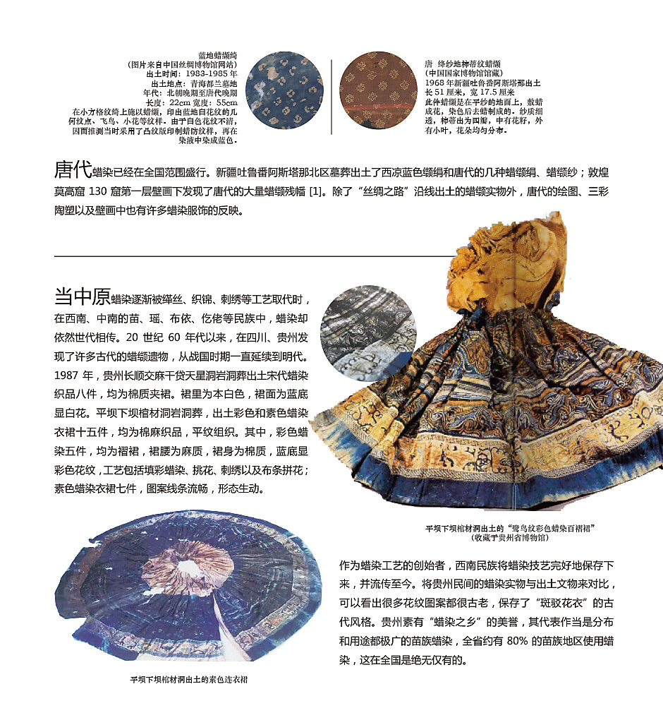 在东汉又时期,蜡染技术已相当成熟。到了西晋,已可染出十余种色彩的蜡染产品。1959 年在新疆民丰东汉墓发现汉代“蓝白蜡染布”两片。其中一片是圆圈、圆点几何纹样组成花边,大面积地铺满平行交叉线构成的三角格子纹;一片系小方块纹,下端还有一半体像。这份珍贵的蜡染实物史料反映出汉代的蜡染工艺已达到相当精巧的程度。